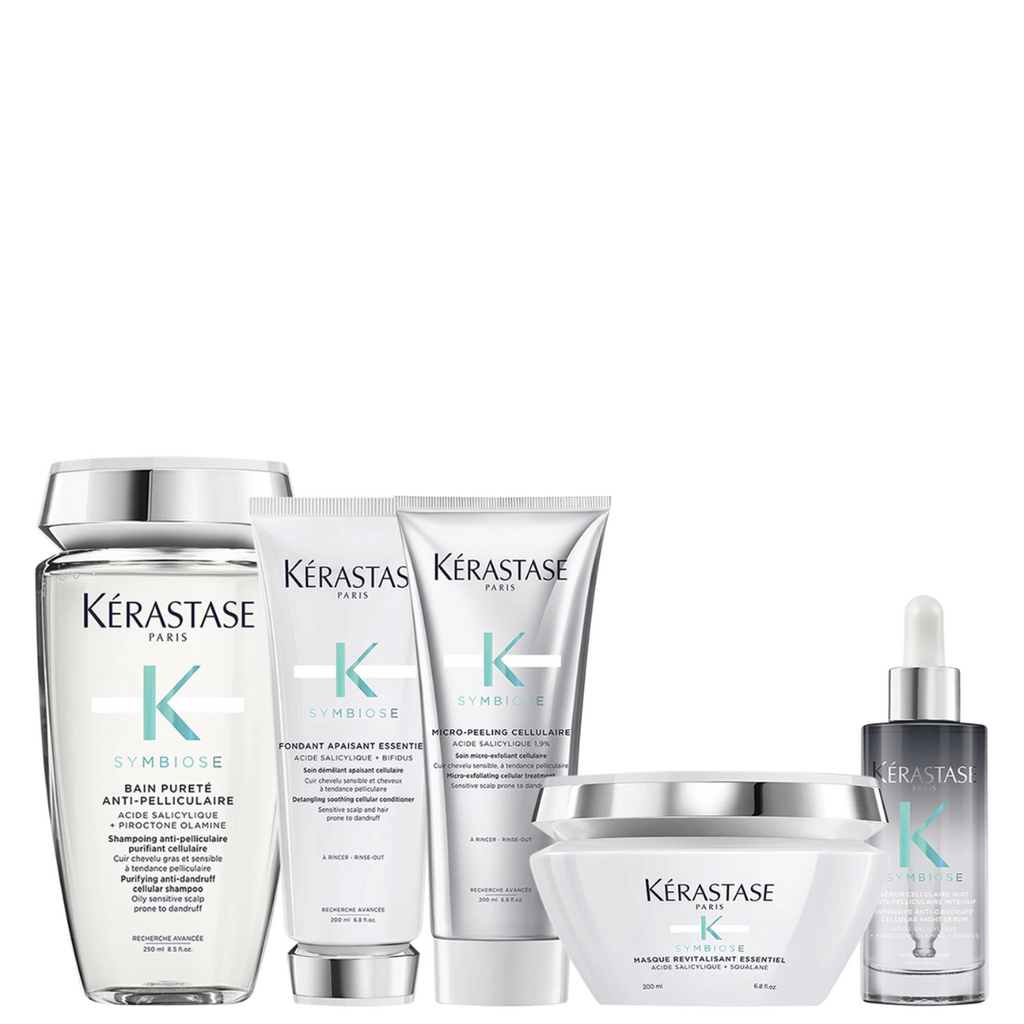 El Kit Kérastase Symbiose Purificante Completo es un tratamiento profesional "pa' el cuero cabelludo" con tendencia a la caspa. Gracias a sus fórmulas "avanzadas" con ácido salicílico, piroctona olamina y bifidus, limpia "a fondo", hidrata, calma y elimina los signos de la caspa, mientras cuida el pelo y el cuero cabelludo.